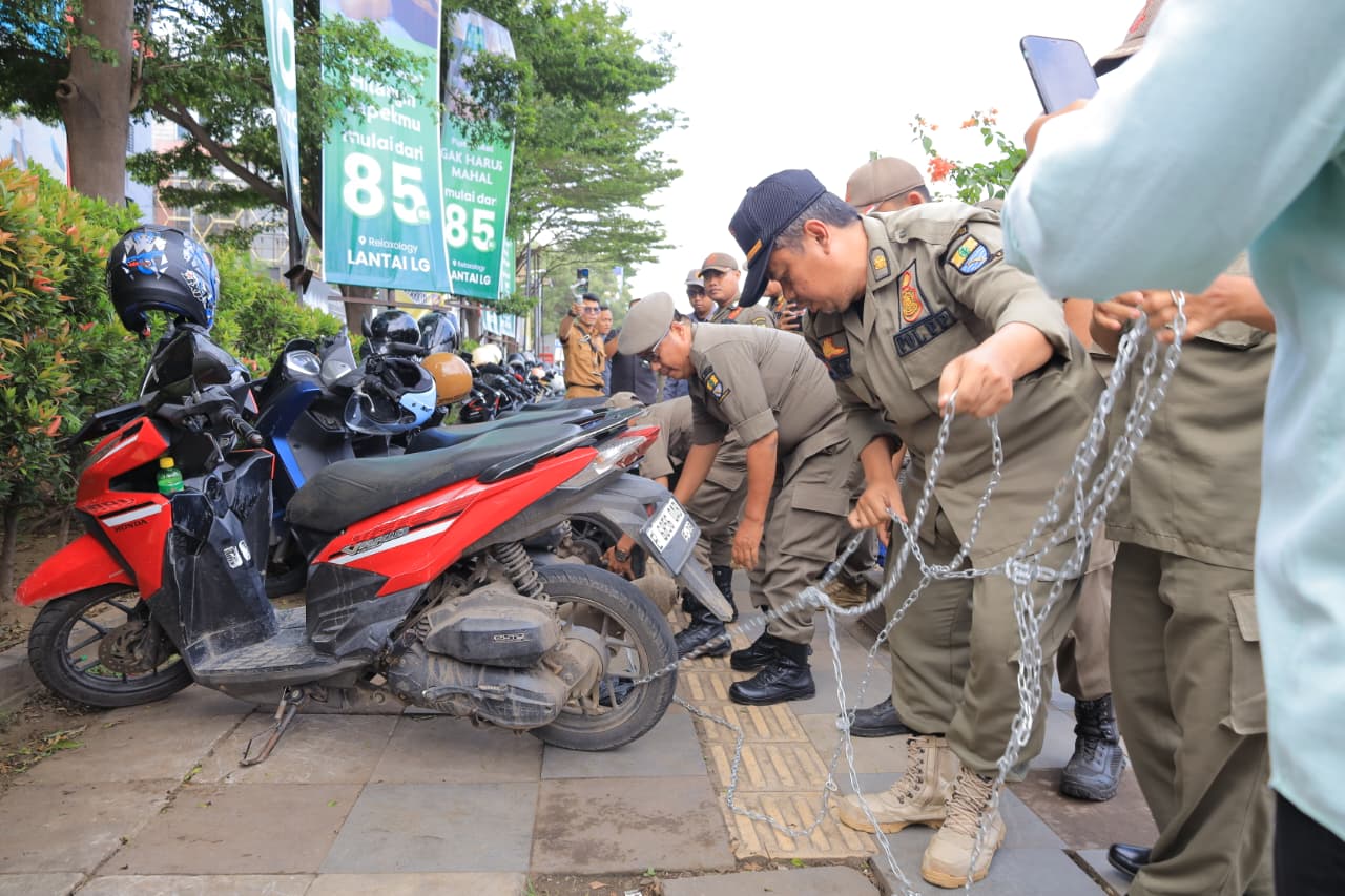 Tindakan tegas dengan memasang rantai pada roda motor yang terpakir sembarangan. Sebanyak 36 motor terjaring dalam penindakan tersebut.