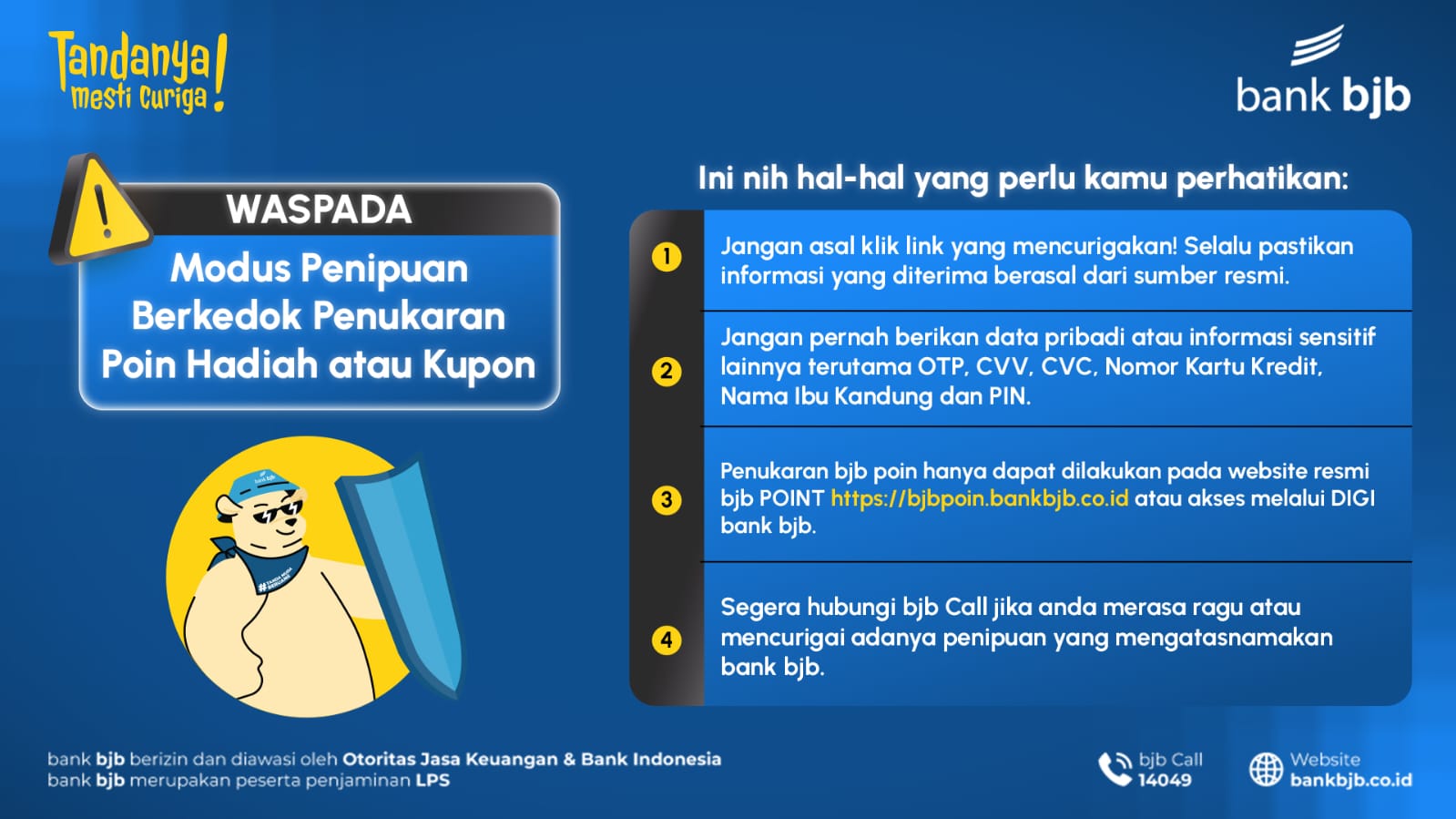 bank bjb menegaskan bahwa penukaran bjb POIN hanya dapat dilakukan melalui website resmi https://bjbpoin.bankbjb.co.id atau melalui aplikasi DIGI bank bjb. Oleh karena itu, setiap nasabah diimbau untuk lebih berhati-hati dalam menerima pesan dari media apapun yang berisi tautan atau link mencurigakan, meskipun pesan tersebut terlihat resmi seperti berasal dari bank.