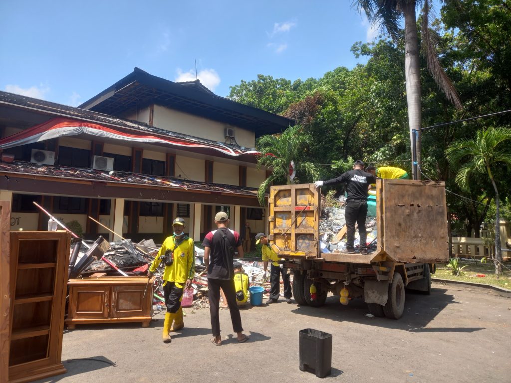 Mediacirebon.id– Pasca kerusuhan, tim gabungan membersihkan kantor DPRD Kabupaten Cirebon dari puing dan kaca yang dirusak massa, Senin (1/9/2025). Kerusakan di Kantor DPRD cukup parah. Seluruh ruangan dan fasilitas yang ada di dalam gedung porak poranda.