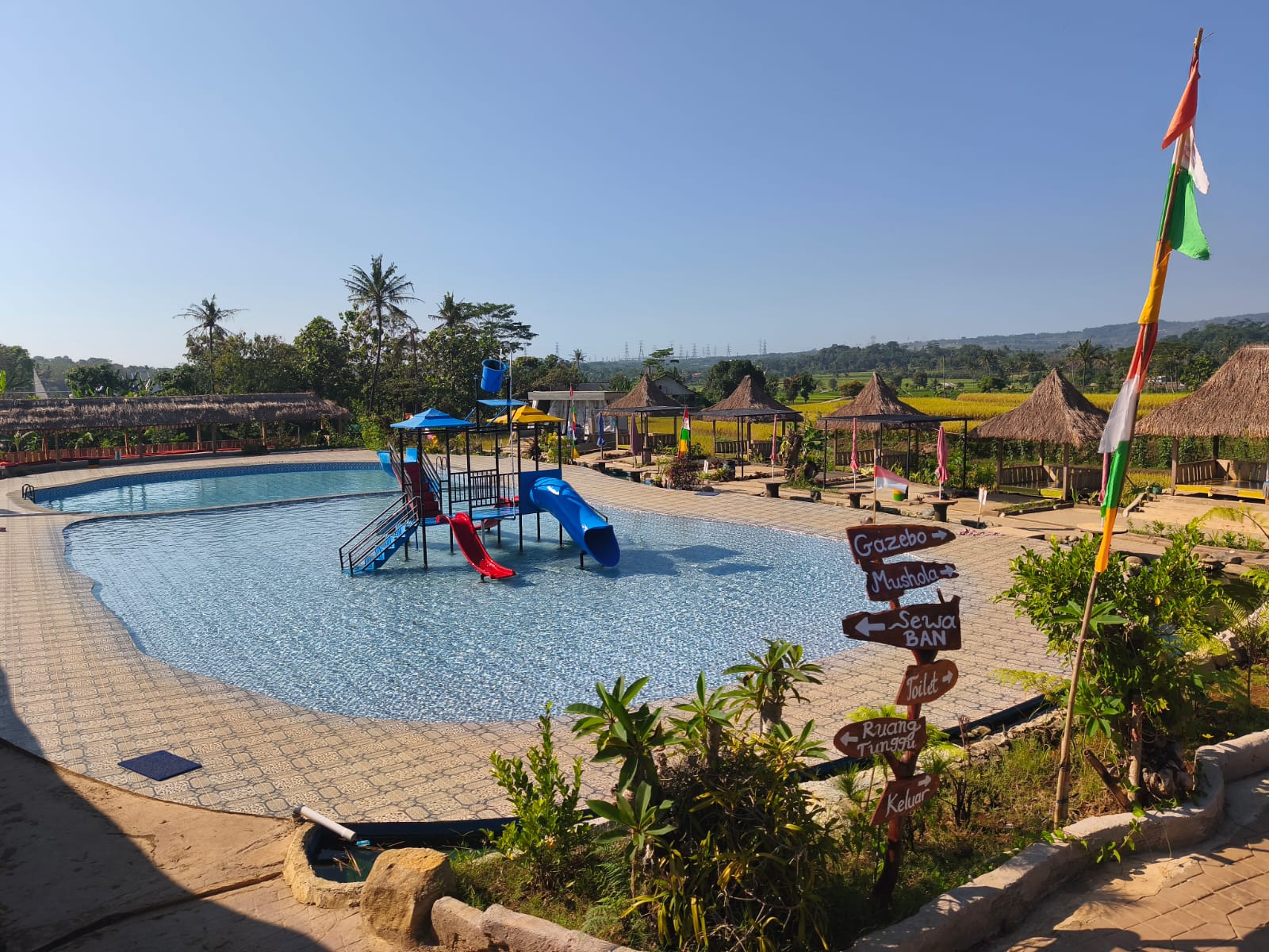 Kolam Renang Cikomboy menawarkan pemandangan Gunung Ciremai dan Hamparan Sawah yang cocok memanjakan mata, sembari merasakan dingin air pegunungan.
