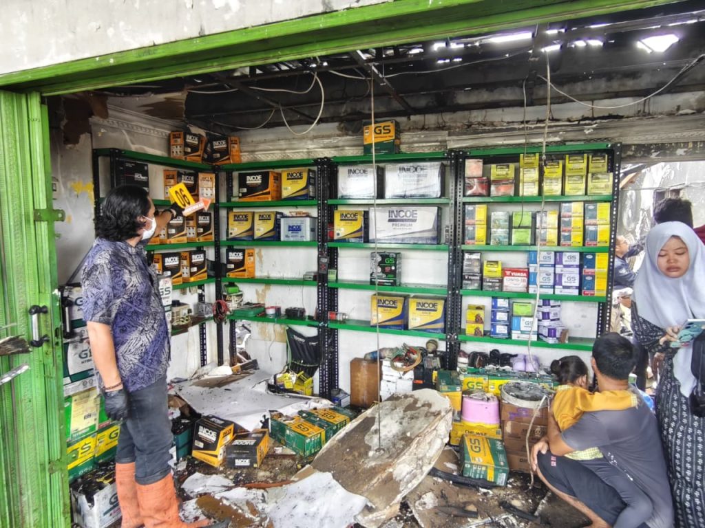 “Sejumlah barang di dalam bengkel dan toko aki hangus terbakar, di antaranyatiga motor, lemari pendingin, televisi tabung, serta bagian atap bangunan yang mengalami kerusakan parah akibat jilatan api,” jelasnya.
